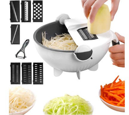 A Multifunction Wet Basket Vegetable Cutter. The item is capable of both cutting and washing vegetables. It has 5 types of cutting attachments that can slice, shred and even grate vegetables according to suitability. It also includes a handheld slicer. Besides being a vegetable cutter, it is itself a washing basket that can be used for washing and rinsing vegetables in general.
